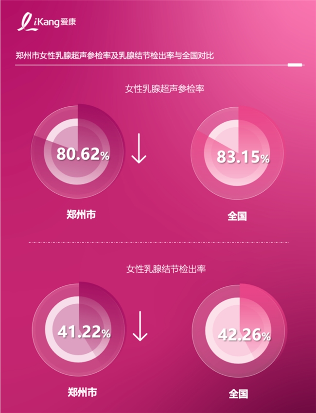 地区间女性筛查意识差异也在一定程度上影响了乳腺疾病的检出率,以地处中原的郑州市为例,女性乳腺超声参检率为80.62%,低于全国的平均水平(83.15%),反映出当地女性筛查参与度仍有提升空间。同时,郑州市女性乳腺结节检出率为41.22%,略低于全国均值。