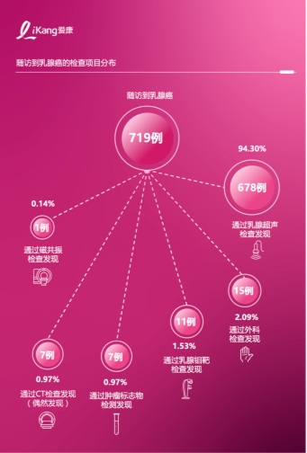 乳腺结节的普遍性反映出女性乳腺健康形势的严峻。尽管大多数乳腺结节属于良性病变,但仍有1%-2%可能发展为乳腺癌②。粉红报告显示,在298.38万位的女性体检人群中,爱康集团已随访到乳腺癌719例,后续随访工作仍在进行中,预计会有更多确诊病例被发现。