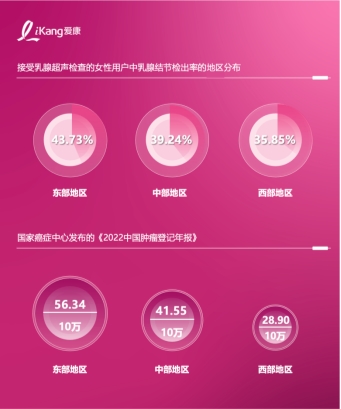 从地域分布看,经济实力和竞争压力一起“遥遥领先”的东部地区乳腺结节检出率最高,达43.73%。中部地区为39.24%,西部地区最低(35.85%),这一趋势与国家癌症中心统计的乳腺癌发病率在地理分区分布上呈正相关。