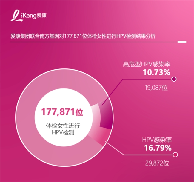 除乳腺癌外,宫颈癌和卵巢癌也是暗藏在女性身边的“沉默杀手”。宫颈癌更是中国女性最常见的妇科恶性肿瘤之一,位居中国女性癌症新发病例TOP5①。高危型人乳头瘤病毒(HPV)持续感染是其主要病因。粉红报告显示,2023年3月1日到2025年8月15日,爱康集团联合南方基因对177,871位体检女性进行了HPV检测,其中29,872人(16.79%)感染HPV,10.73%为高危型HPV感染。