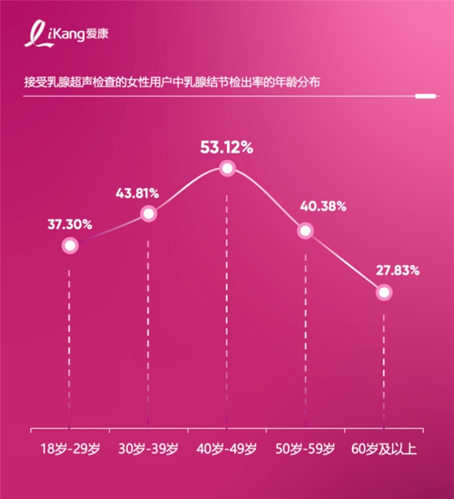 随着年龄的增长,乳腺结节的检出率呈现先升后降趋势。其中,上有老下有小的40岁-49岁女性,成为检出率最高的年龄段,高达53.12%,可能与这一年龄阶段女性体内激素水平的显著波动有关。