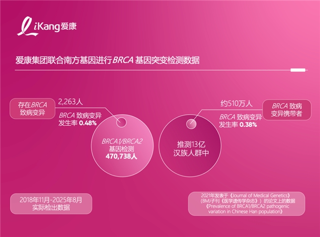 对部分女性而言,乳腺癌发病风险早已写入基因。研究发现,携带BRCA1/2基因突变的女性更易受到乳腺癌“攻击”。而通过BRCA1/2基因检测可以提前直面“天命”,提前评估自身风险并及早干预。2018年11月至2025年8月,共计有470,738位爱康用户进行了BRCA1/BRCA2基因检测,其中有2,263位用户的BRCA1/BRCA2基因存在致病变异,致病变异率为0.48%。这与上海交通大学医学院附属第一人民医院、中国科学院植物生理生态研究所、爱康集团和南方基因在2021年发表于《Journal of Medical Genetics》的论文中的数据(女性和男性)基本一致。